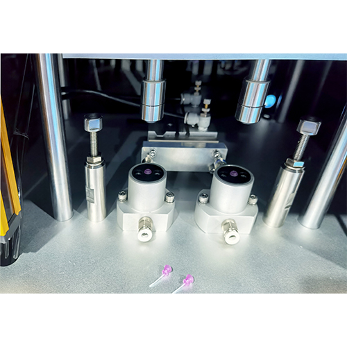 医用留置针头气密测试工装,针头放入底座后,侧气缸抵住针头前端软管部位实现密封,上气缸下压进行端面封堵,然后加压测试。