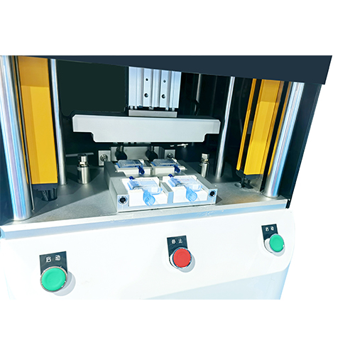 医用抽药器气密测试工装,夹具配有4个聚四氟仿形底座,底盘采用旋转结构,两件产品测试时可以取放另外两件产品,提高夹具测试效率。
