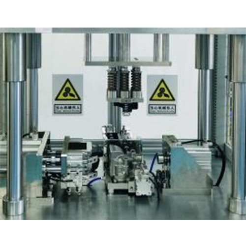 冷却壳体气密测试工装,底部为带仿形的内涨封堵结构,侧面大面采用端面加夹钳结构封堵,上方使用弹簧压紧结构带尼龙仿形块让下压*的同时避免压伤产品,配有打标装置和限位装置。